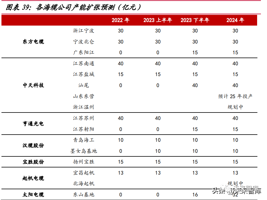 疫情因素減弱,疊加海纜較高的毛利率,海纜企業擴大產能的動機較強。東方電 纜陽江基地、中天科技(維權)汕尾基地和亨通光電射陽基地 2023 年下半年投產,預計分別 擴大產能 15 億、40 億和 15 億;漢纜股份墨女島已建成,投產時間預計在 23 年初, 擴產可達 10 億;太陽電纜正在建設東山海纜生產基地,產能可達 32 億。