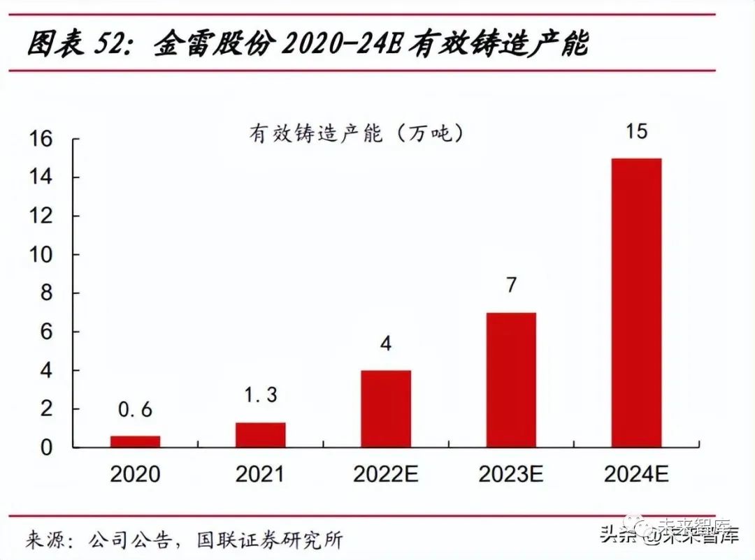海風引領主軸鍛改鑄趨勢。風機大型化趨勢下主軸鑄造工藝趨勢明確,隨著大 型海上風機主軸尺寸越來越大,鍛造主軸因為生產設備的限制,不適用于大型風機;同時直驅和半直驅機型份額占比增加,主軸在中低速傳動工況下相比于雙饋高速傳 動性能要求略有降低,部分風電整機供應商基于降本壓力及輕量化的需求,鑄造主 軸占比將有望提升。龍頭金雷股份(44.320, -1.12, -2.46%)優勢明顯。金雷股份東營海上風電核心部件數字化制造項目也在 持續推進中,項目規劃鑄造產能共 40 萬噸,目前一期工程已開工建設,規劃產能 10 萬噸,預計將于 2023 年中旬投產,貢獻 50%的產能,2023 年預計公司鑄造產 能有望達到 7-8 萬噸,2024 年有望達到 15 萬噸。