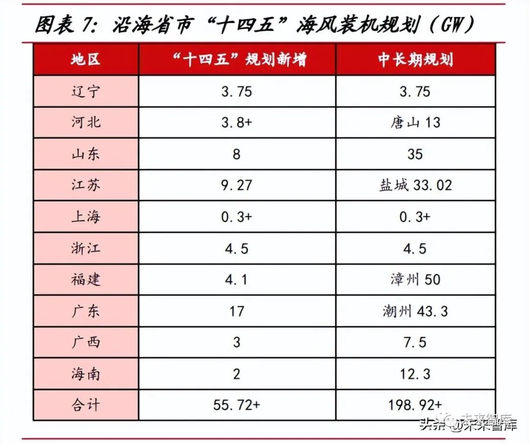 “十四五”規劃充沛,中長期發展可期。截至 2022 年,我國沿海省市已發 布“十四五”海上風電發展規劃,整體規劃新增裝機規模有望突破 55GW,2021- 22 年我國海風新增裝機約 21GW,對應 2023-25 年裝機規模約 34GW??紤]到部 分地區相關海風項目已實現平價上網,海風降本超預期,再結合廣東、山東、浙江 等地區已出臺地補政策支持海風建設,我們預計海風需求以及新增裝機或超過沿海 地區規劃規模,中性假設條件下,2023-25 年我國海風新增裝機規模有望超 40GW, 2023 年在行業充沛的招標量下,新增裝機規模有望達 10GW,同比實現翻倍增長。根據風芒能源統計,我國已出臺的海上風電規劃體量接近 200GW,中長期發展空 間廣闊。