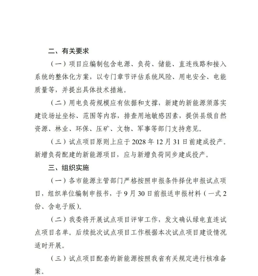 試點項目原則上應(yīng)于2028年12月31日前建成投產(chǎn)。新增負荷配建的新能源項目,應(yīng)與新增負荷同步建成投產(chǎn)。
