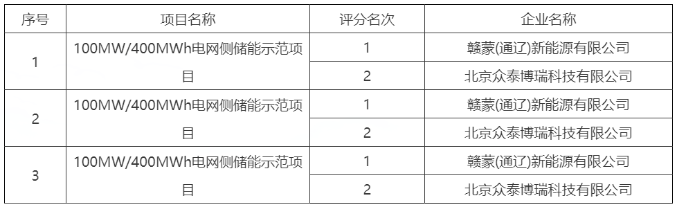 最終三個項目,第一中標候選人均為贛蒙(通遼)新能源有限公司,第二名均為北京眾泰博瑞科技有限公司。
